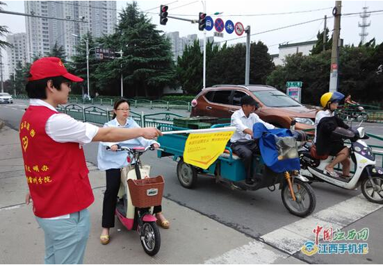 吉安市在市直单位机关干部中招募志愿者,参与文明交通志愿服务工作。在每天上午7时至9时,下午17时至19时,在市中心城区主要交通路口都能看到志愿者的身影。他们开展普法宣传和案例宣传,对行人不遵守红绿灯、不走斑马线、乱穿马路等行为进行劝导和制止,对电动车等非机动车走机动车道、横穿马路、争道抢行等行为进行劝导和制止,强化他们的自律意识和文明意识,对违法电动车、摩托车驾驶员及不听劝阻的行人依法进行教育查纠。